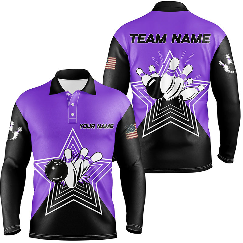 Purple & Black retro bowling ball pins star custom Men's bowling Polo, Quarter Zip shirts team jerseys NQS7831