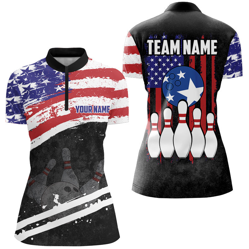 Retro American Flag Bowling Polo, Quarter Zip Shirts For Women Custom Patriotic Bowling Team Jerseys NQS8639