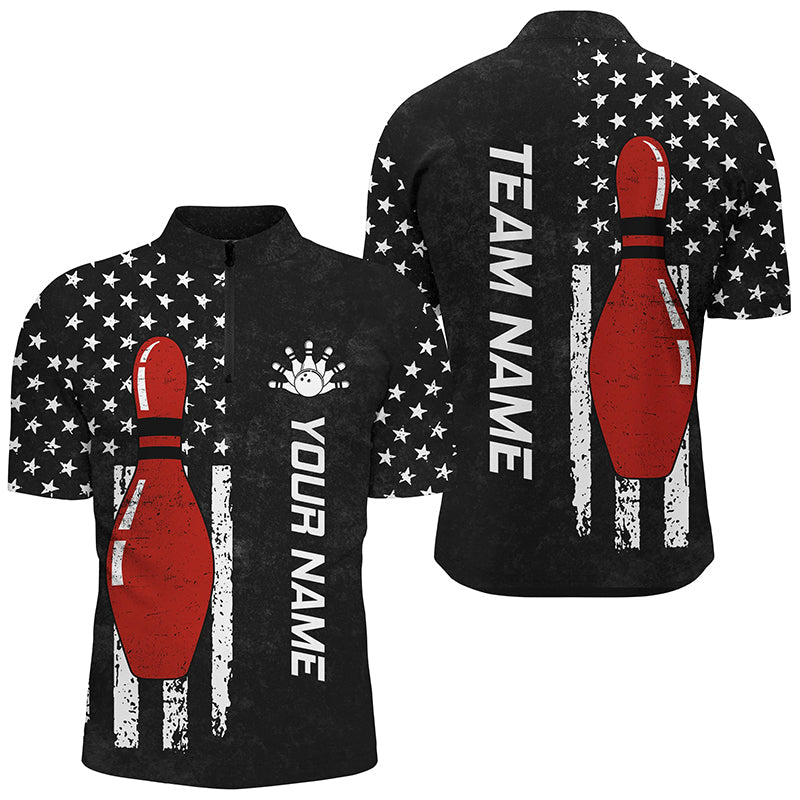 Retro Black American Flag Men Bowling Polo, Quarter zip Shirts Custom Patriotic Bowling Team Jerseys NQS8414