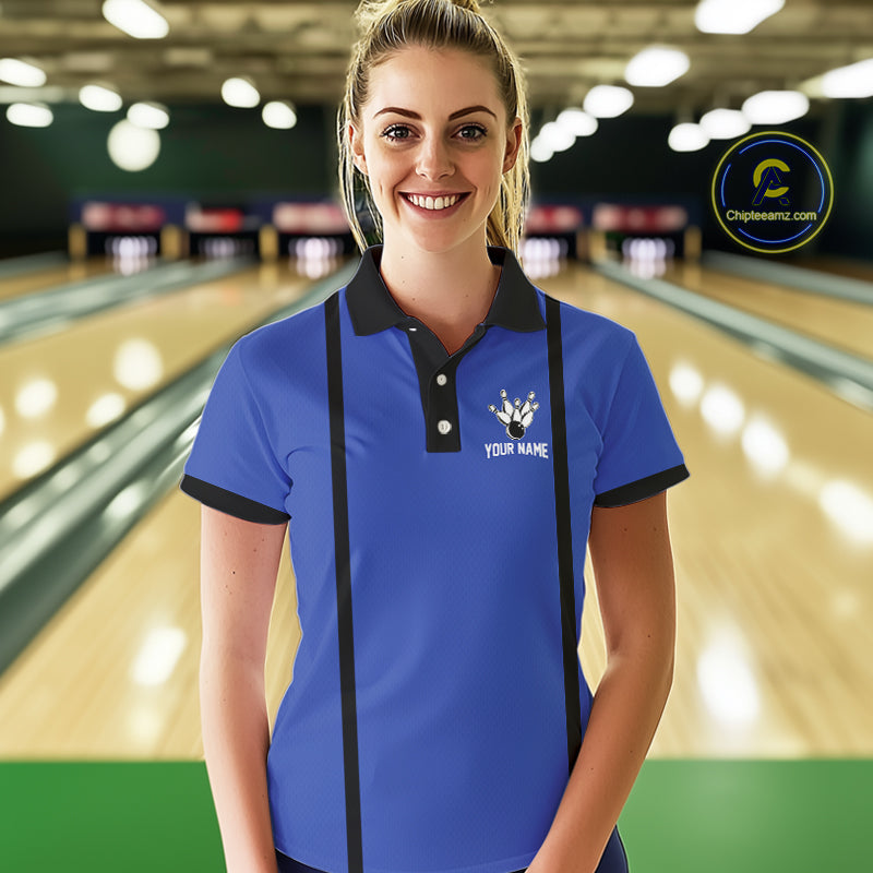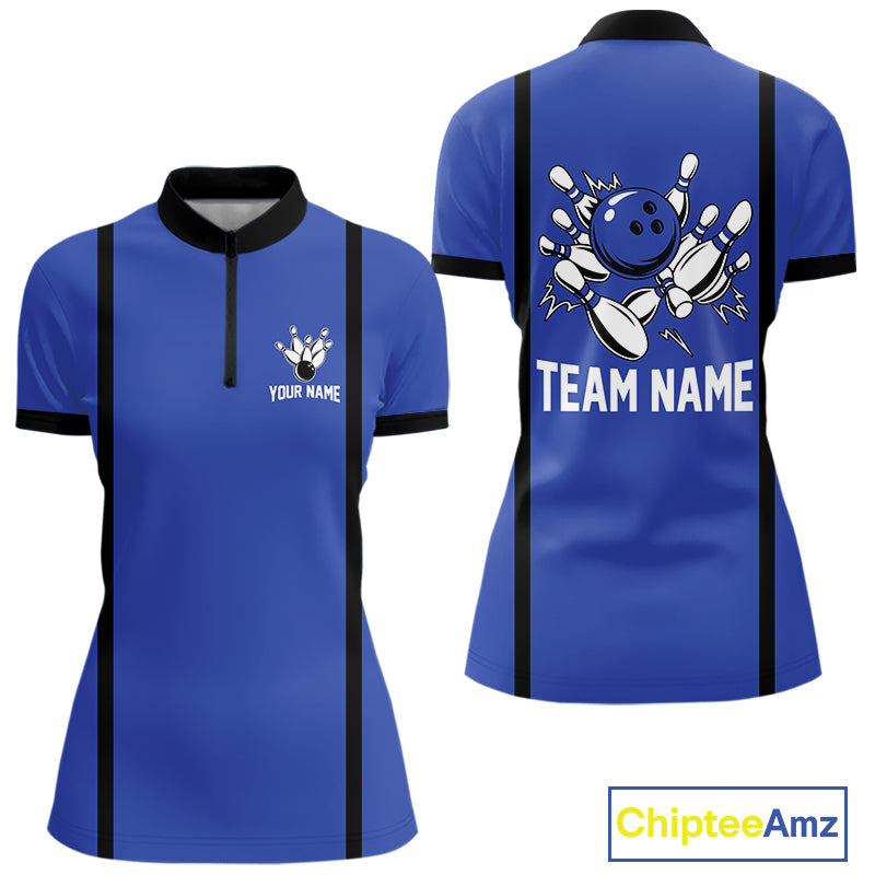 Retro Bowling Polo, Quarter Zip shirts For Women custom bowling team shirts Bowler Outfits | Blue NQS10546