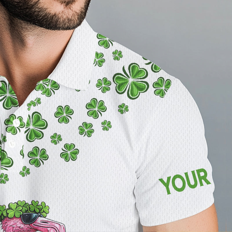 Funny Flamingo Green clover pattern White golf polo shirt for Men Custom St Patrick Day golf apparel NQS9399