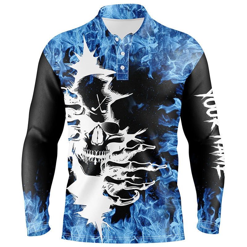 Black Mens golf polo shirt custom blue fire skull golf shirts, personalized golf gifts NQS6544