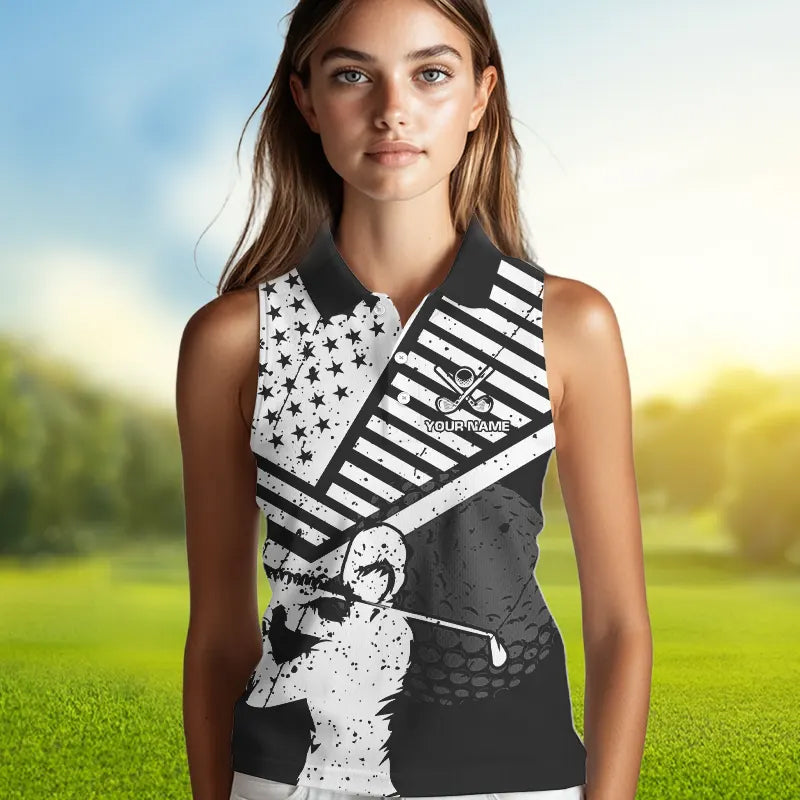 Black and White American Flag Women Sleeveless polo shirt custom patriotic golf apparel team jerseys NQS9605