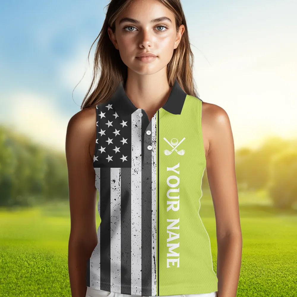 Black White Retro American Flag Women Sleeveless Polo Shirt Custom Patriotic Golf Team Shirt | Green NQS9637