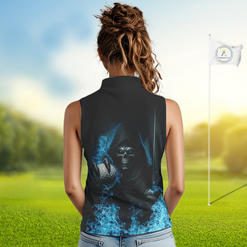 Blue Flame Skull reaper Sleeveless Golf polo shirts custom golf top for ladies, best golf gifts NQS10360