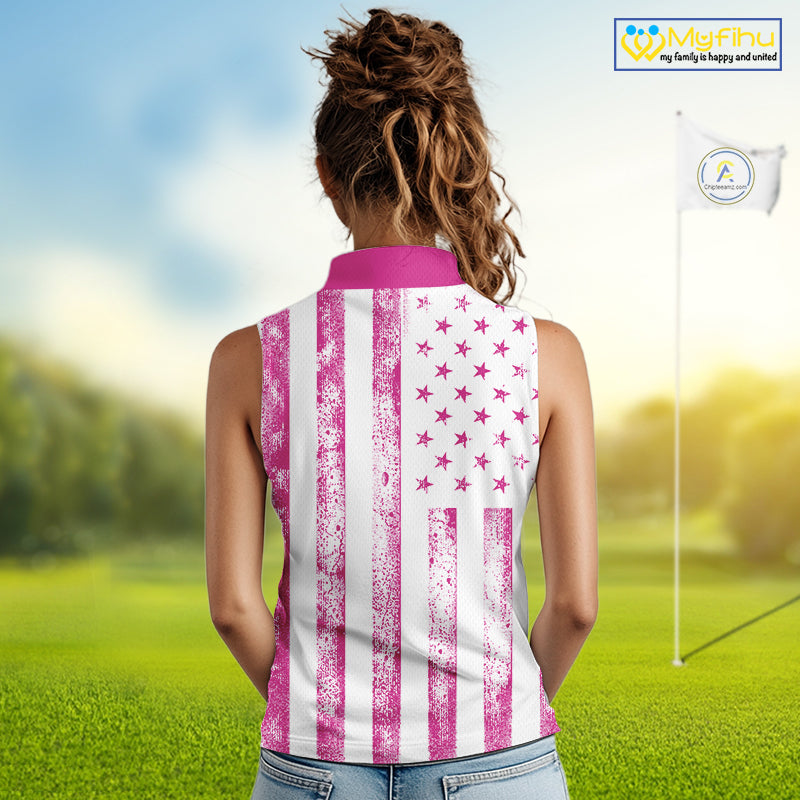 Personalized Pink & White American Flag Retro Women sleeveless polo shirt Patriotic laies golf top NQS10307