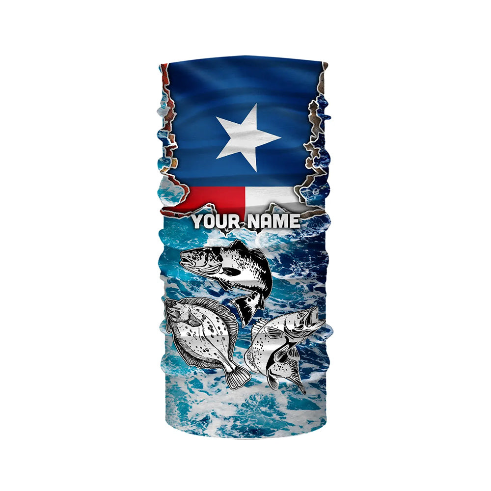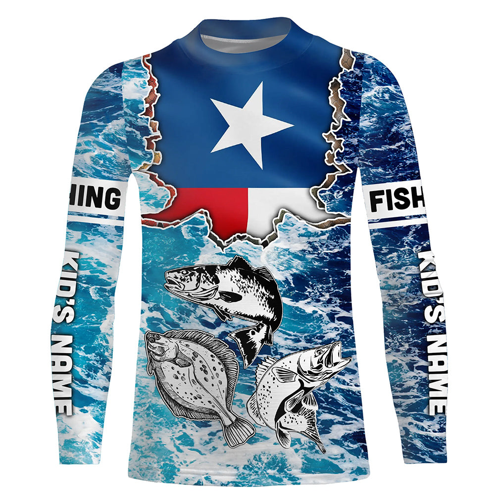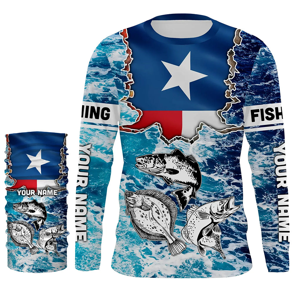 Texas Flag Redfish, trout, flounder blue wave camo custom name performance long sleeve fishing shirts NQS5440