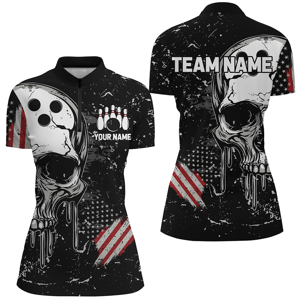 Custom Vintage American Flag Patriotic Bowling Shirts For Women, Skull Bowling Team Shirts IPHW7083