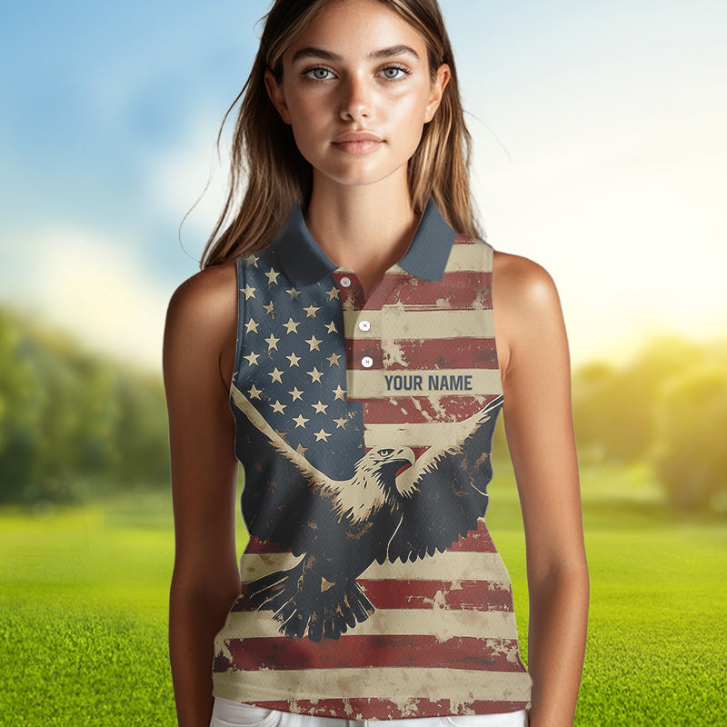 Personalized Vintage Eagle American flag Golf Sleeveless Polo Shirt Custom Patriotic Ladies Golf shirt NQS9632