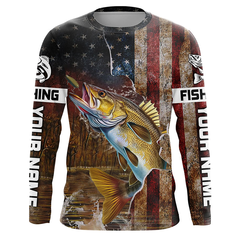 Personalized American Flag Walleye Fishing Shirts,Vintage Patriotic Walleye Fishing Apparel IPHW5734