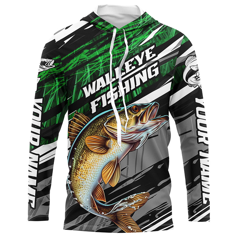 Walleye Fishing Camo Long Sleeve Fishing Shirts, Custom Walleye Tournament Fishing Jerseys | Green IPHW5956