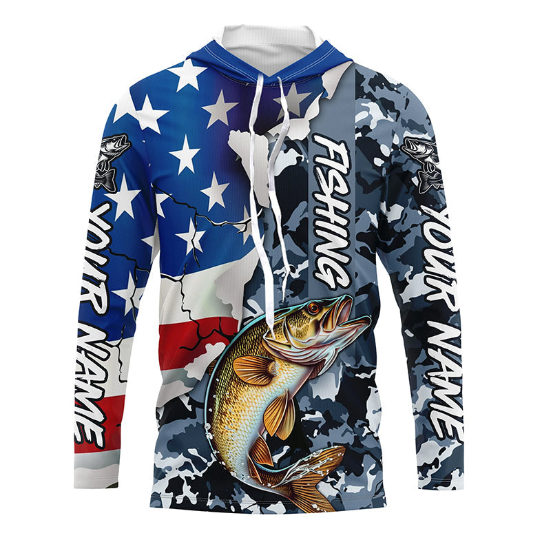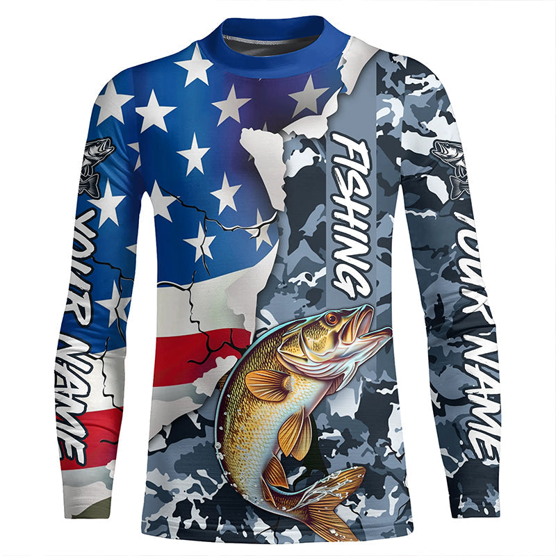 Custom American Flag Walleye Fishing Long Sleeve Shirts, Patriotic Camo Walleye Fishing Jerseys IPHW6104