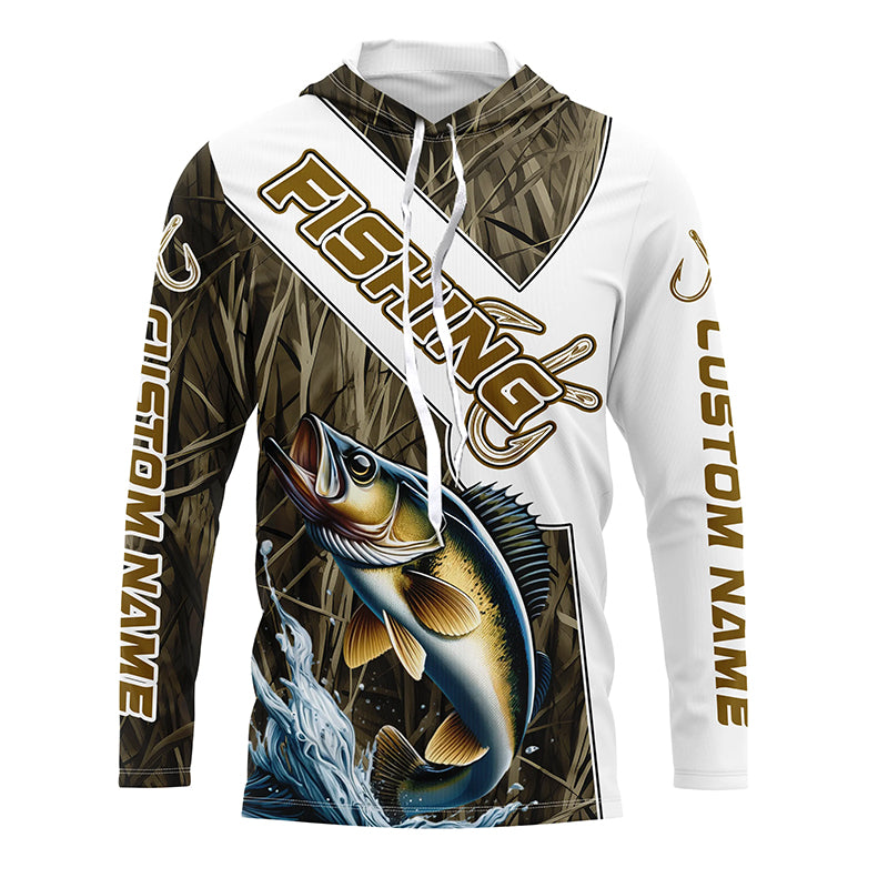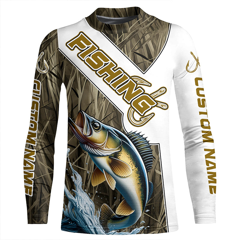 Walleye Fishing Fish Hook Custom Long Sleeve Shirts, Walleye Jerseys Fishing Gifts | Grass Camo IPHW6660