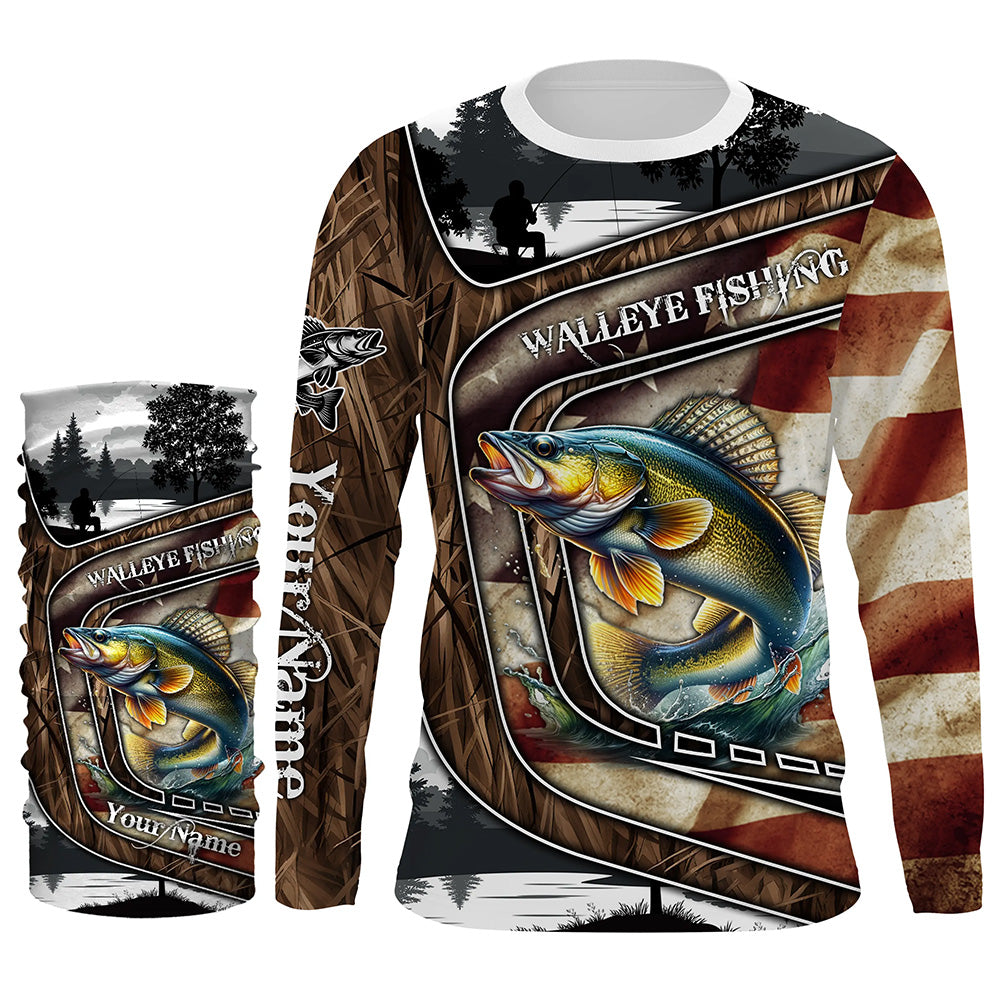 Walleye Fishing camo American flag patriotic Customize name long sleeves fishing shirts NQS1433