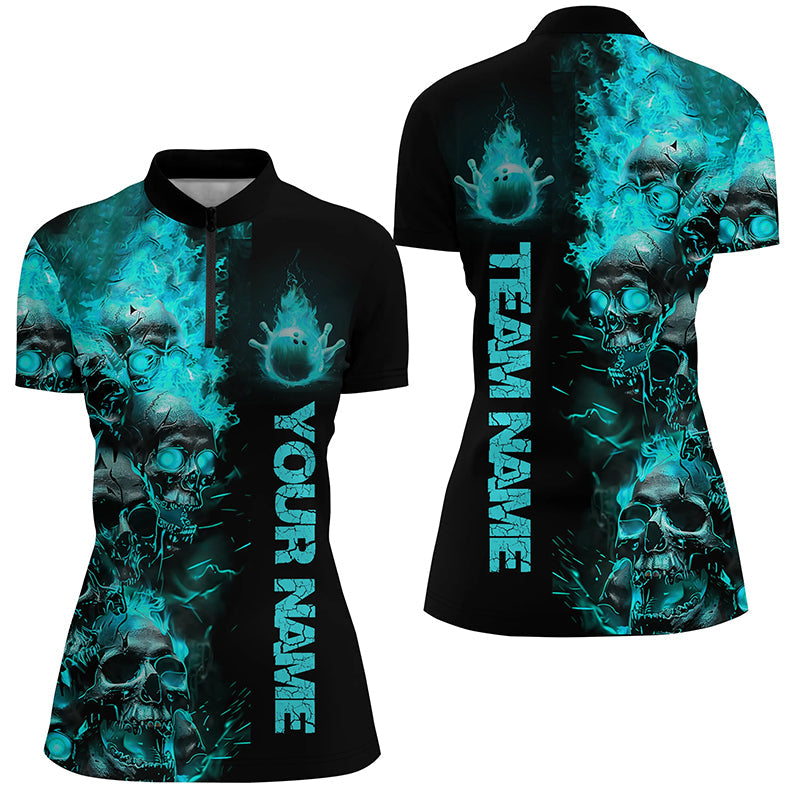 Custom Blue Flame Skull Bowling Shirts For Women, Halloween Bowling Outfit For Bowling Team IPHW7170