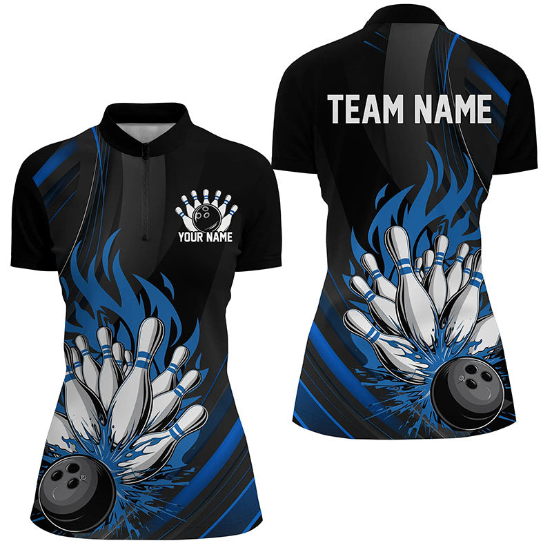 Personalized Ladies Bowling Shirts, Black And Blue Flame Bowling Team Shirt Bowlers Outfit IPHW7208