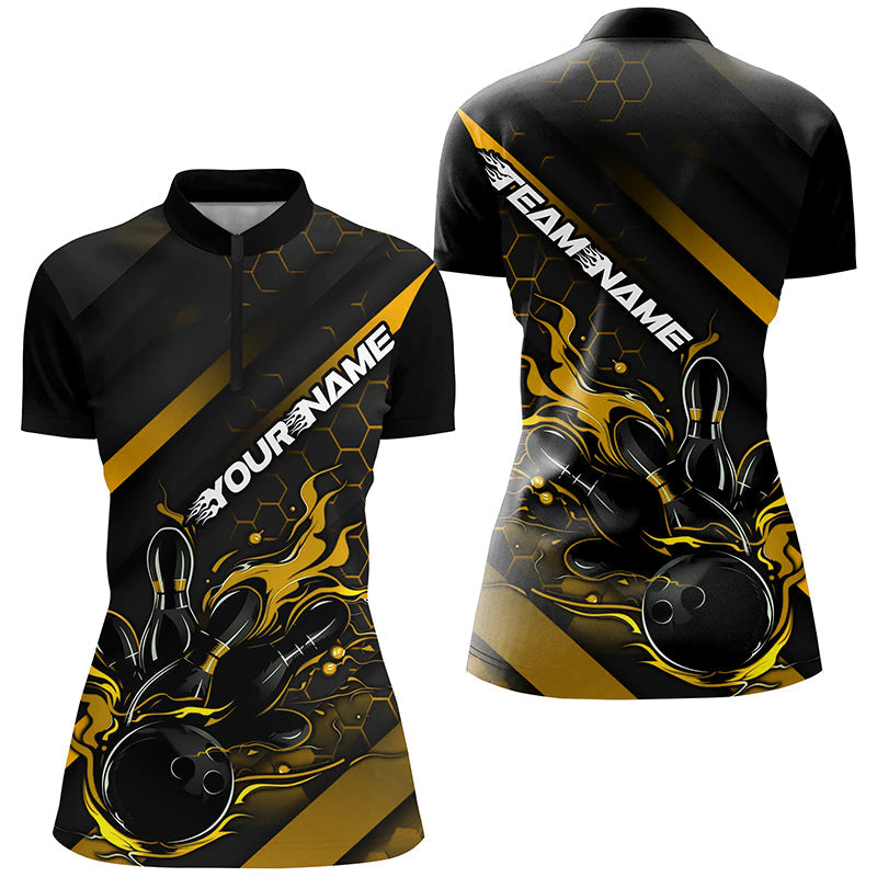 Custom Black And Gold Flame Bowling Shirts For Women, Bowling Team Bowling League Shirts IPHW7505