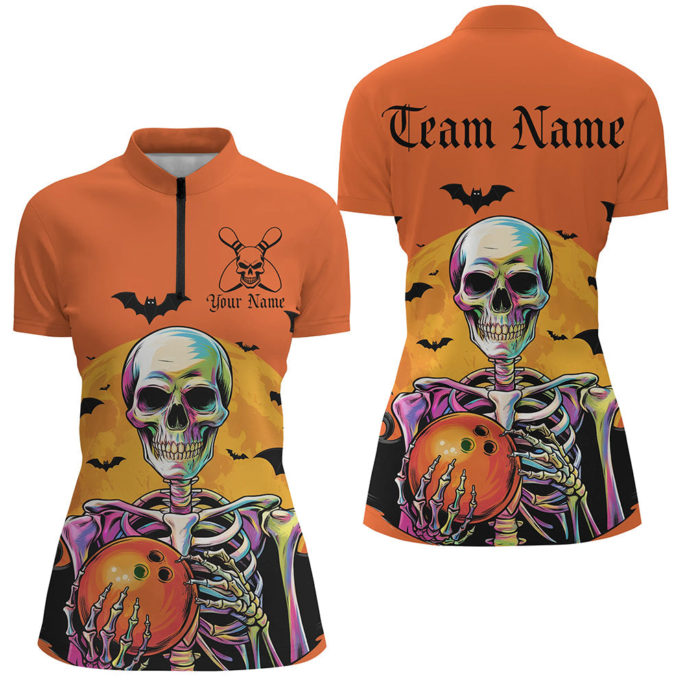 Orange Custom Halloween Bowling Shirts For Women, Skull Bowling Team Shirt Halloween Outfit IPHW7598