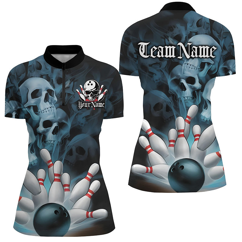 Black And Blue Custom Skull Ladies Bowling Shirts, Gothic Bowling Team Halloween Outfits IPHW7671