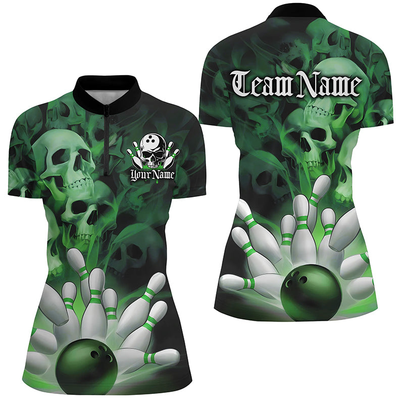 Black And Green Custom Skull Ladies Bowling Shirts, Gothic Bowling Team Halloween Outfits IPHW7673