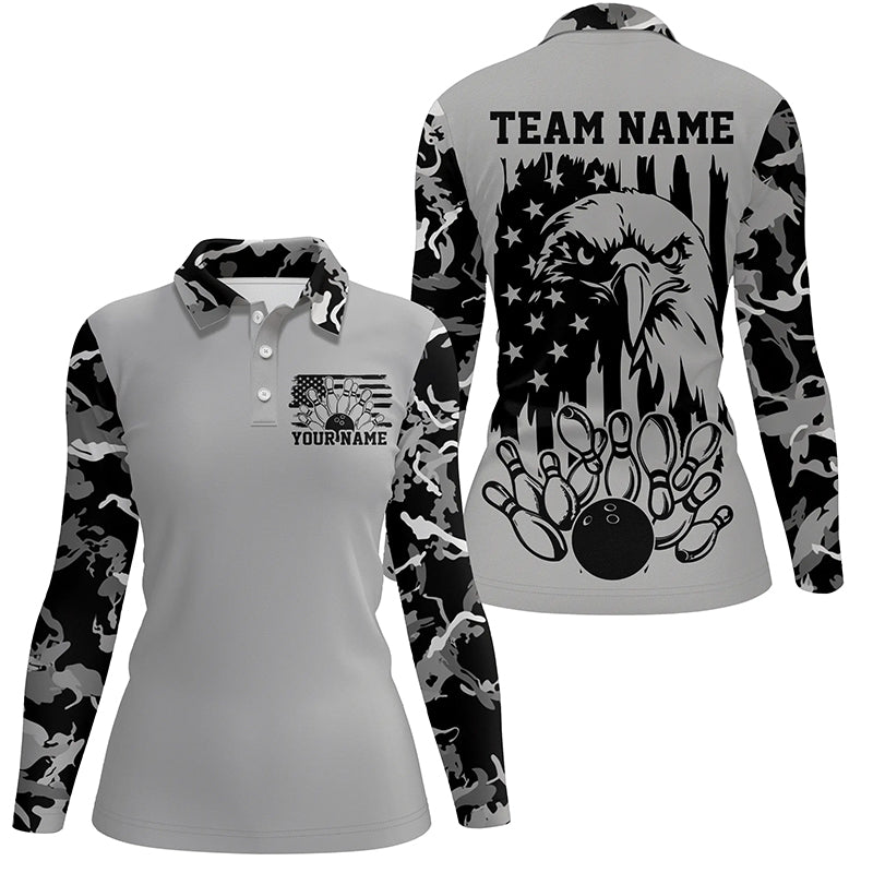 American Flag Eagle Custom Gray Camo Patriotic Bowling Shirts For Women, Us Bowling Shirt IPHW7944