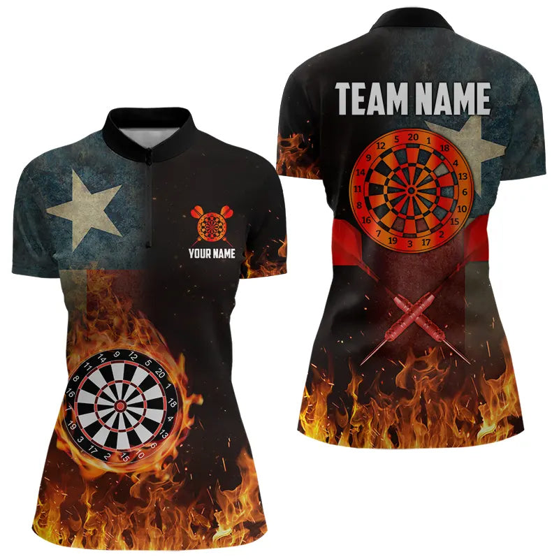 Personalized Retro Texas Flag Flame Dartboard Darts Shirts For Women, Patriotic Texas Dart Jerseys TDM3677