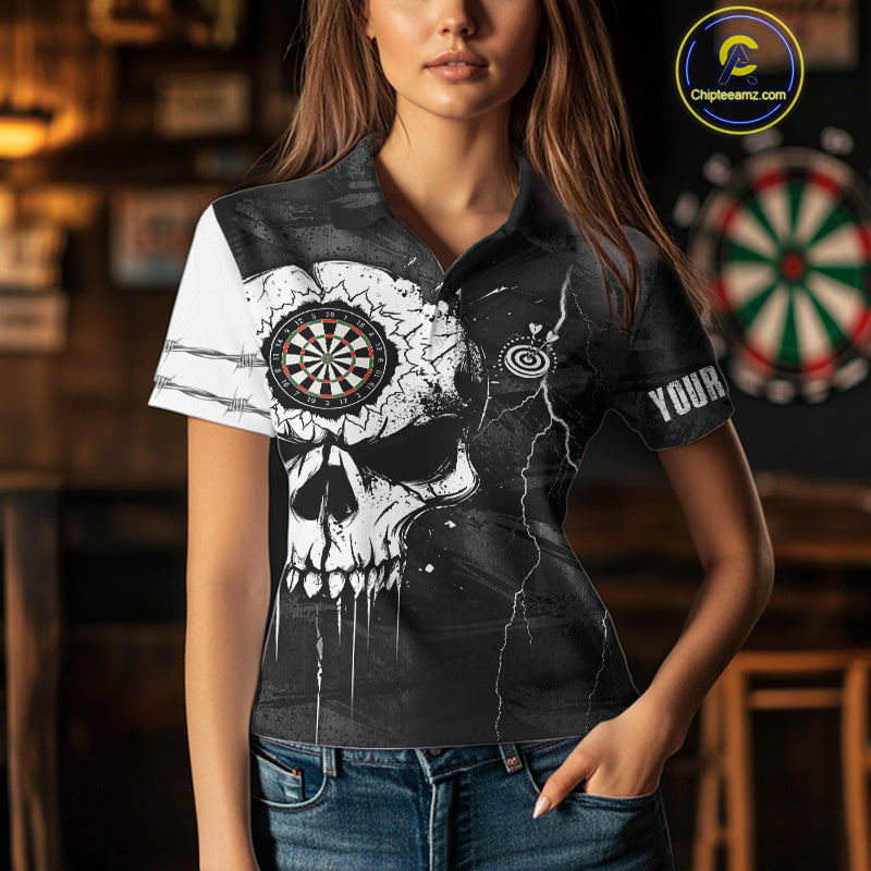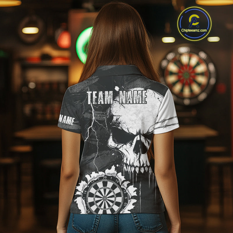 Custom Black And White Grunge Skull Dart Shirts For Women | Team Darts Jerseys - Polo & Quarter Zip TDM3955