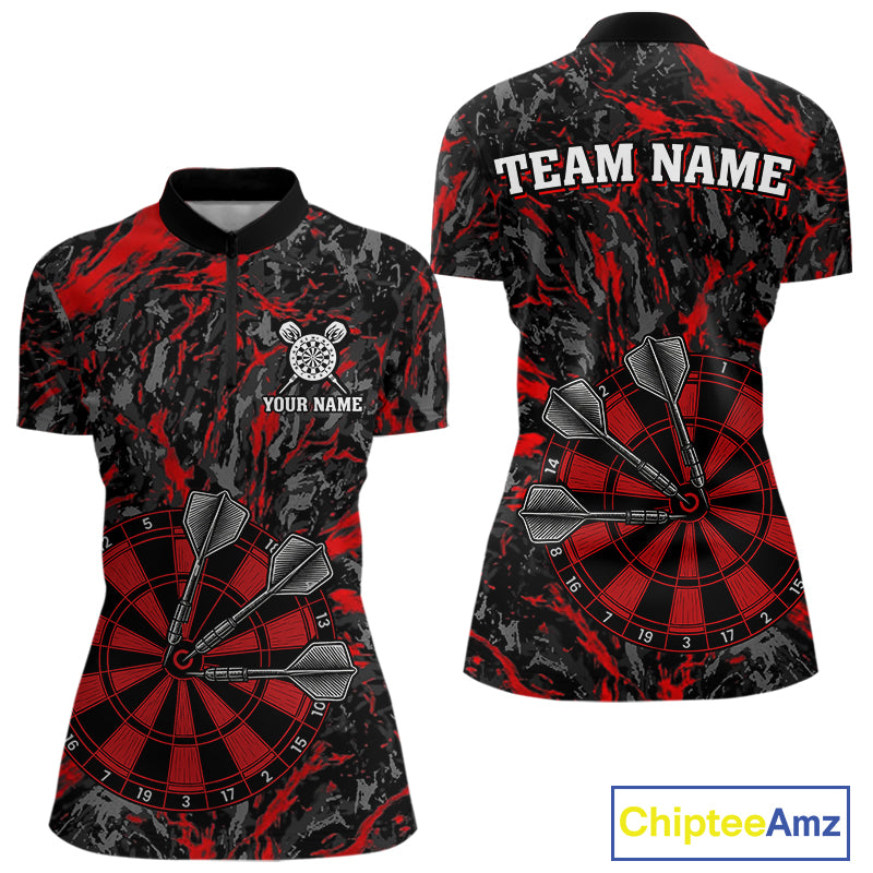 Custom Black And Red Grunge Camo Dart Shirts For Women, Camouflage Dart Team Jersey Polo & 1/4 Zip TDM3959