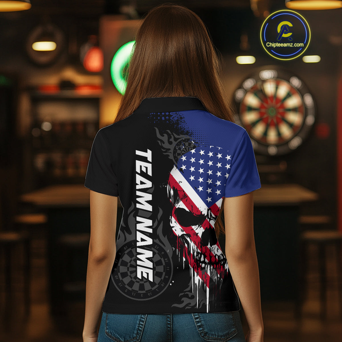 Grunge American Flag Skull Darts Shirt For Women Custom Patriotic Darts Team Jerseys Polo & 1/4 Zip TDM4197