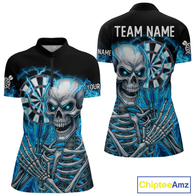 Blue Flaming Lightning Skeleton Darts Shirt For Women Custom Darts Jersey Team Polo & Quarter Zip TDM4344