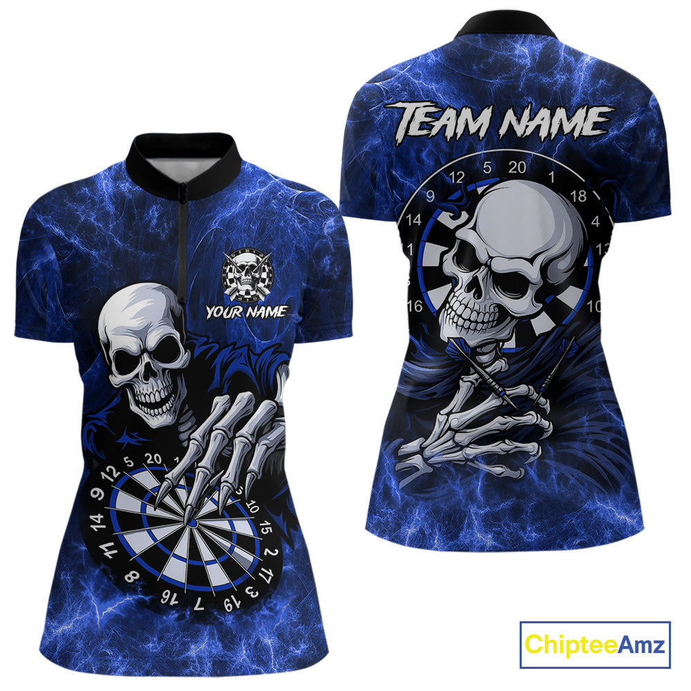 Personalized Blue Funny Skeleton Darts Shirt For Women Custom Skull Darts League Team Jersey TDM4397