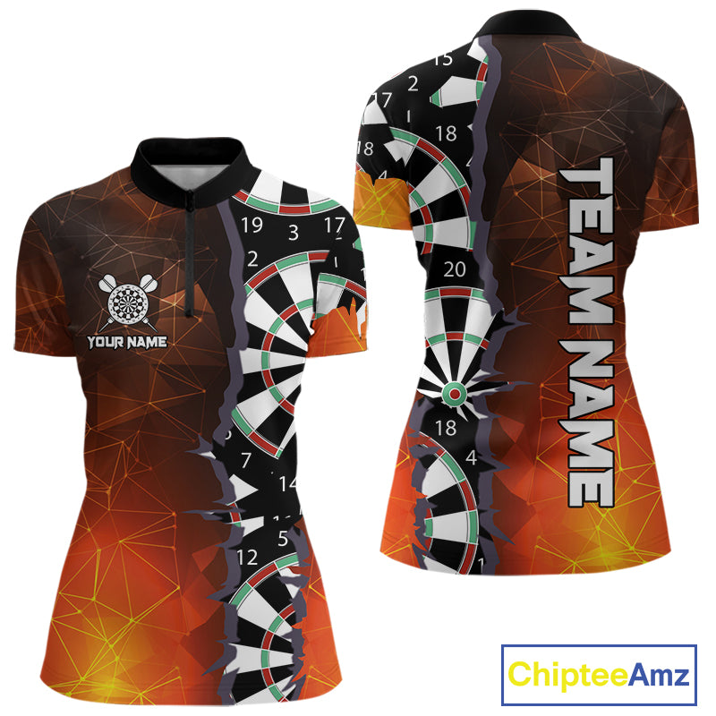 Personalized Fiery Orange Dartboard Crack Darts Shirt For Women, Funny Darts Jersey Polo & 1/4 Zip TDM4449
