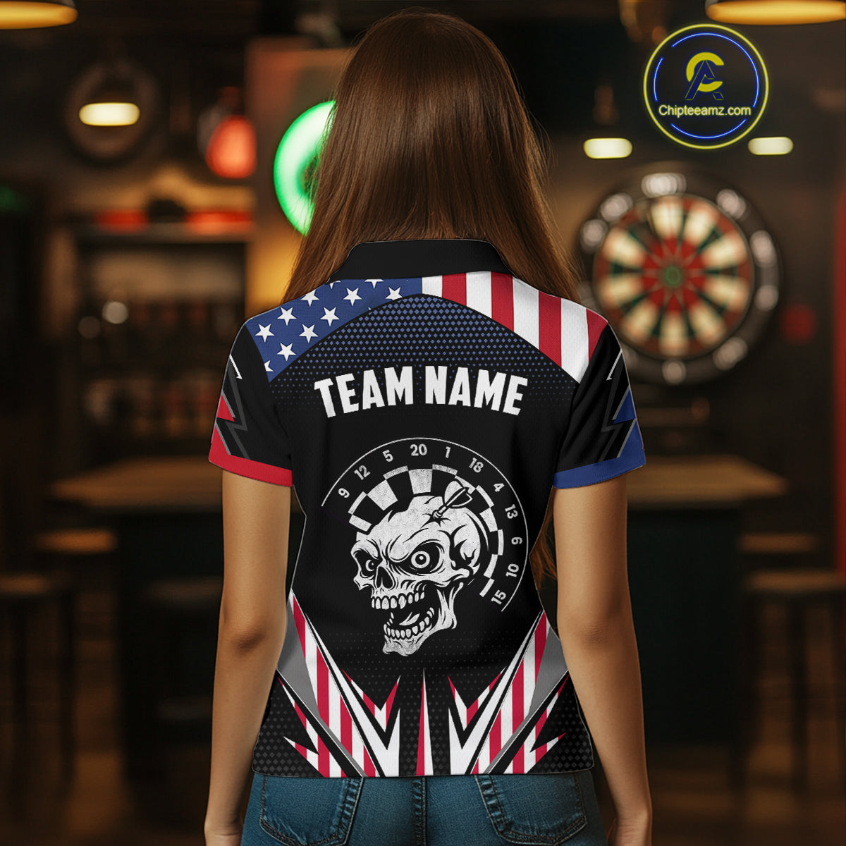 Personalized Patriotic Skull Darts Shirt For Women Custom American Flag Darts Jersey Polo & 1/4 Zip TDM4463