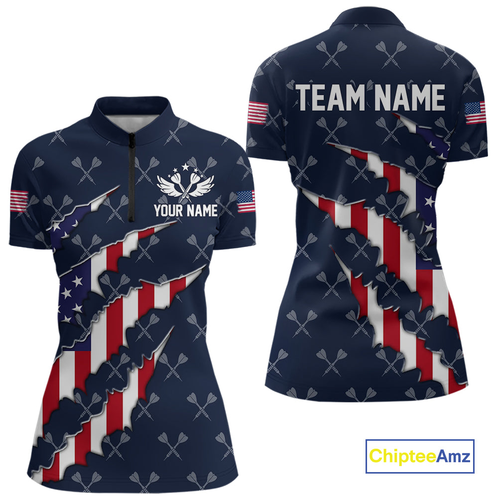 Personalized American Flag Navy Dart Pattern Polo & Quarter Zip For Women, Patriotic Darts Jersey TDM4996