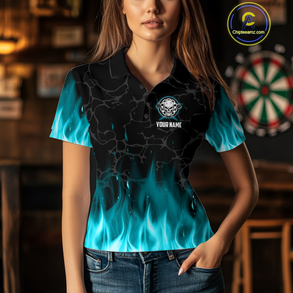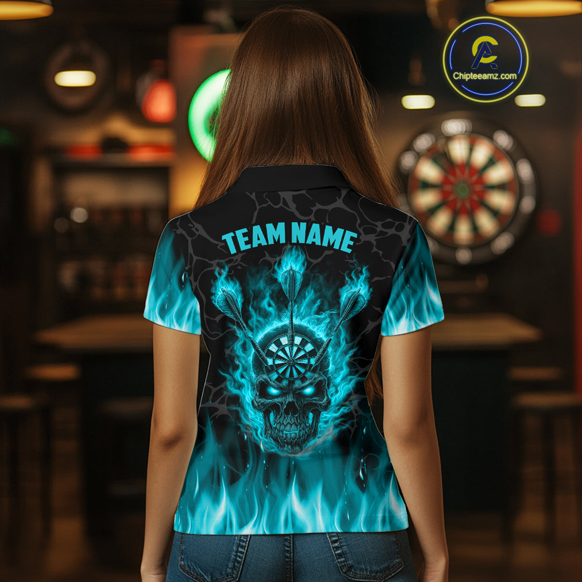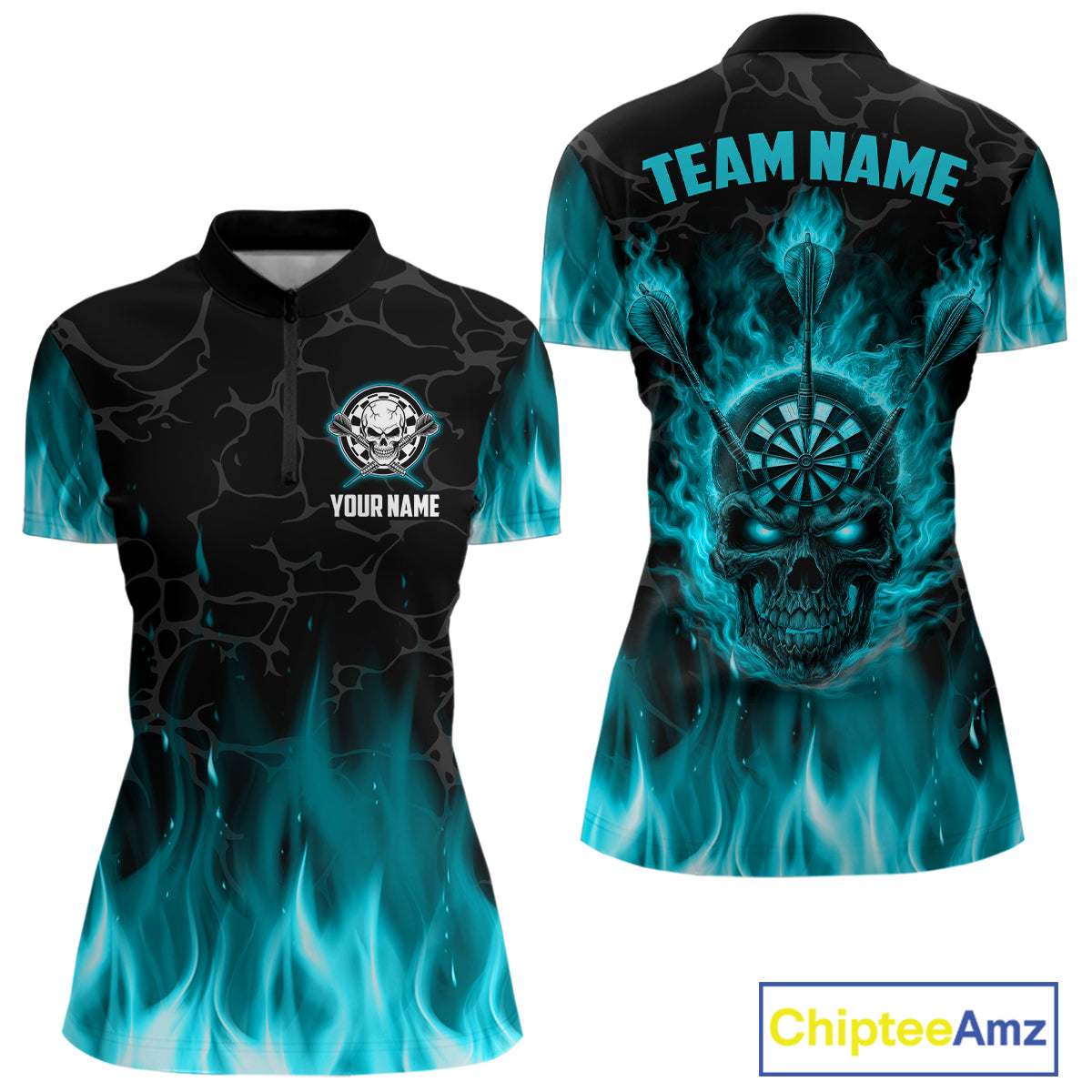 Fire Flame Skull Darts Polo & Quarter Zip Custom Darts Shirts For Women, Darts Team Jersey|Turquoise TDM5320