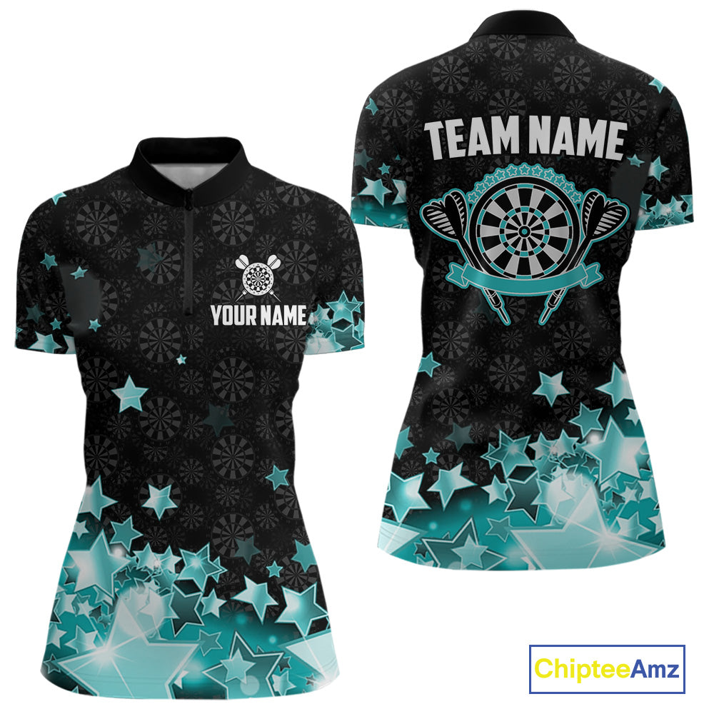 Funny Custom Dart Shirt For Women, Turquoise Black Glowing Star Pattern Darts Polo & Quarter Zip TDM5325