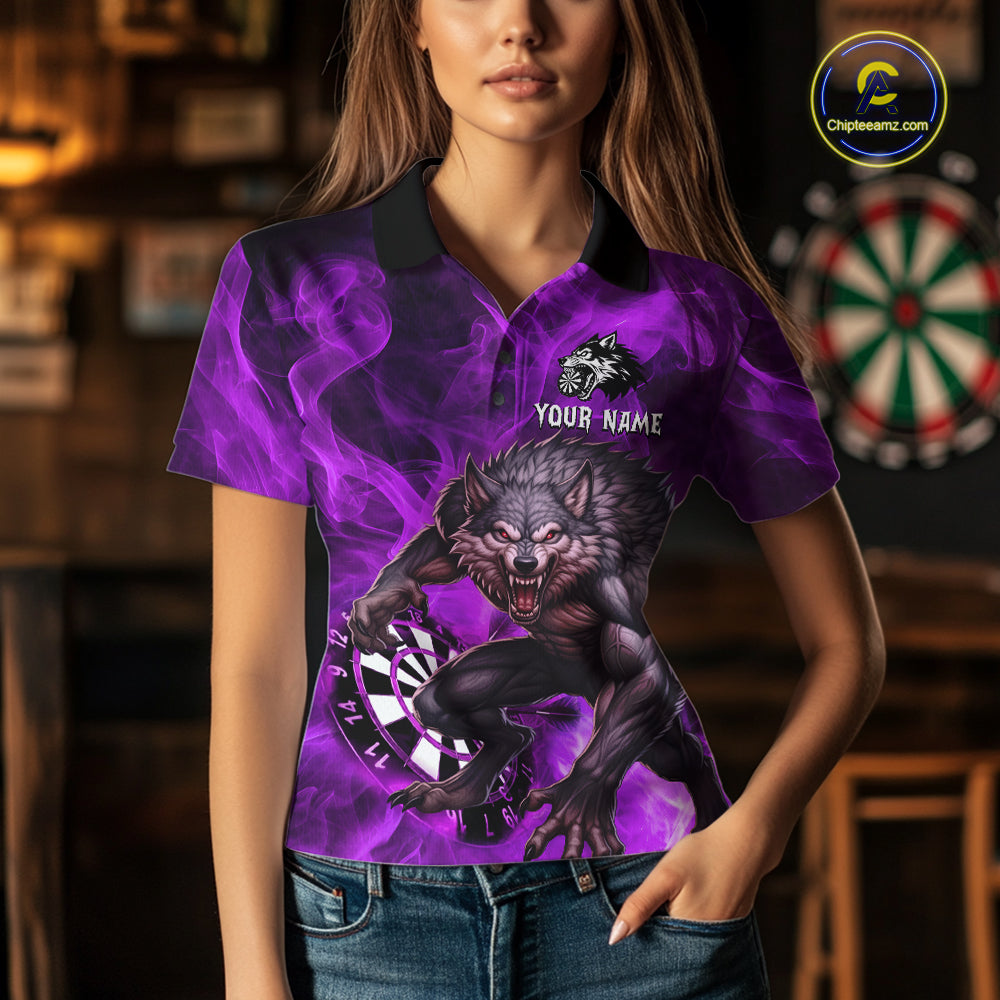 Purple Flaming Wolf Darts Shirt For Women Custom Darts League Jersey Team Polo & Quarter Zip TDM5358