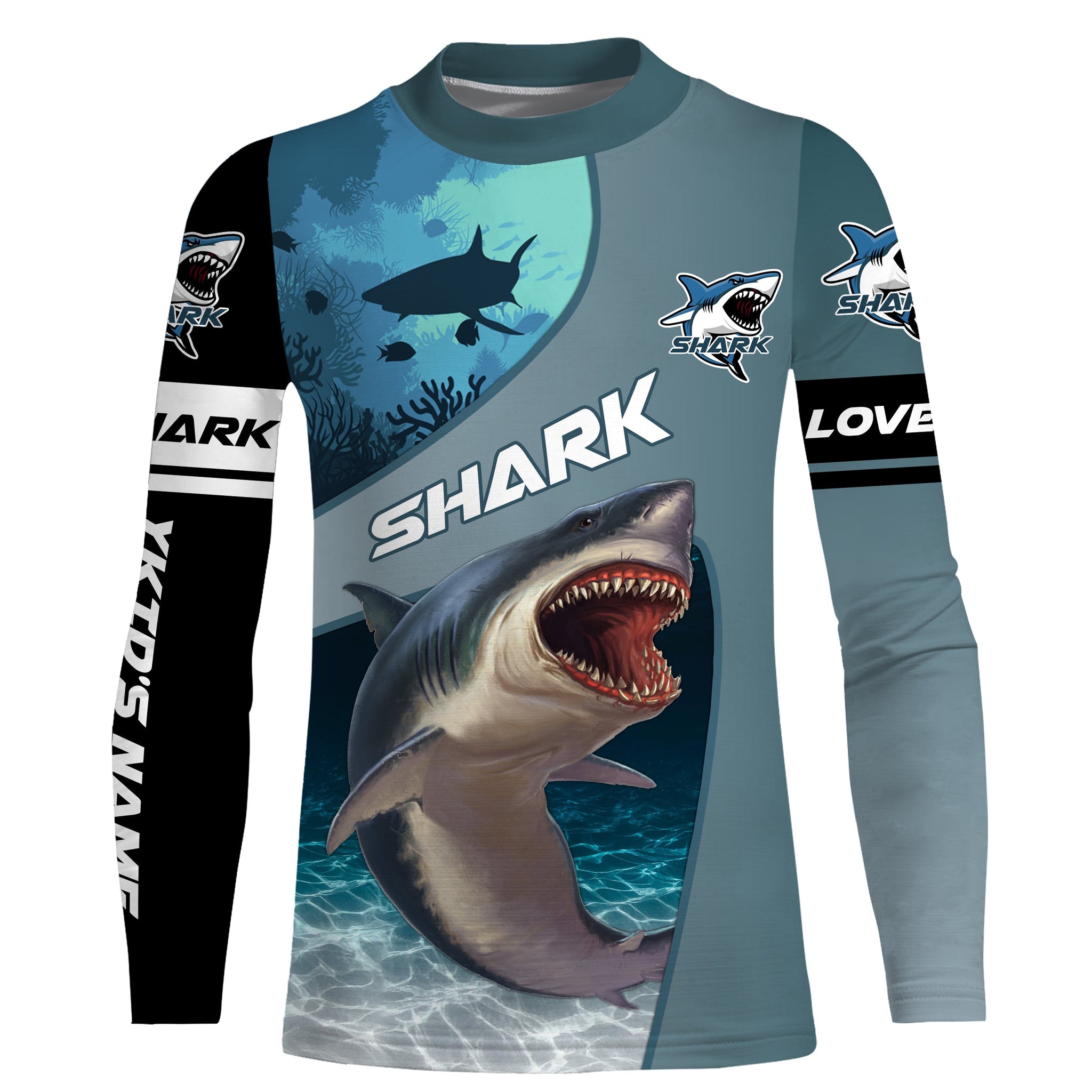 Shark fishing ocean blue color Custom Name 3D UV Protection long sleeve fishing shirts for men, women NQS3036