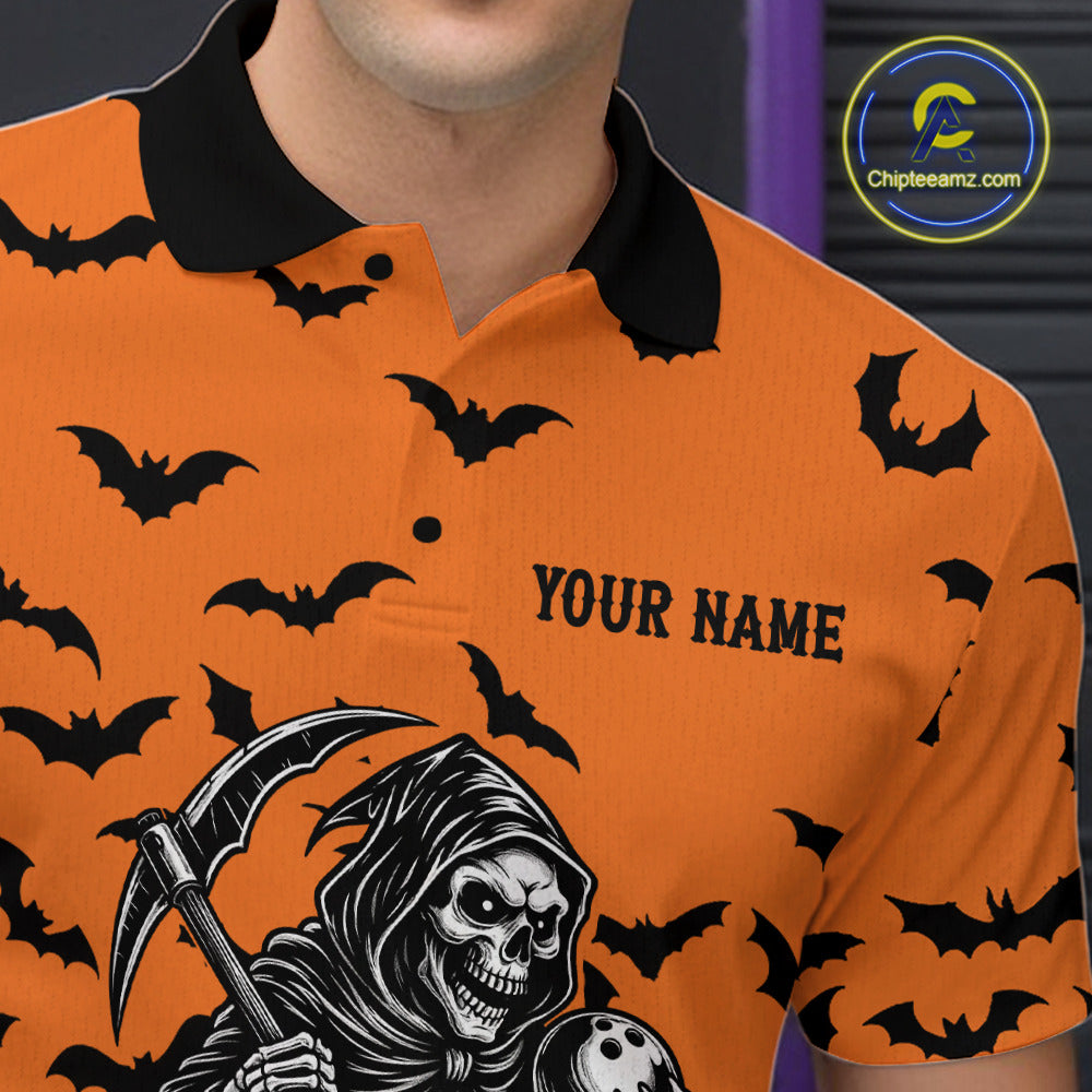 Black and Orange Bats Halloween Skull Reaper Bowling Shirts For Men Custom Bowling Team Jerseys NQS10755