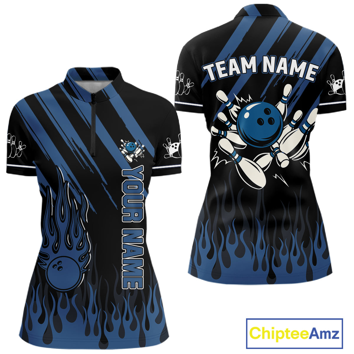 Black & Blue Flame Retro Bowling Polo, Quarter Zip Shirt for Women Custom Vintage Team Bowling Jersey NQS10504