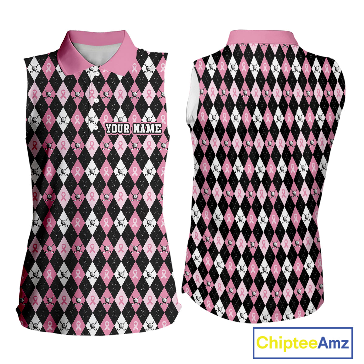 Black & Pink ribbons argyle pattern Sleeveless polo shirt Custom Breast Cancer Awareness golf outfit NQS10513