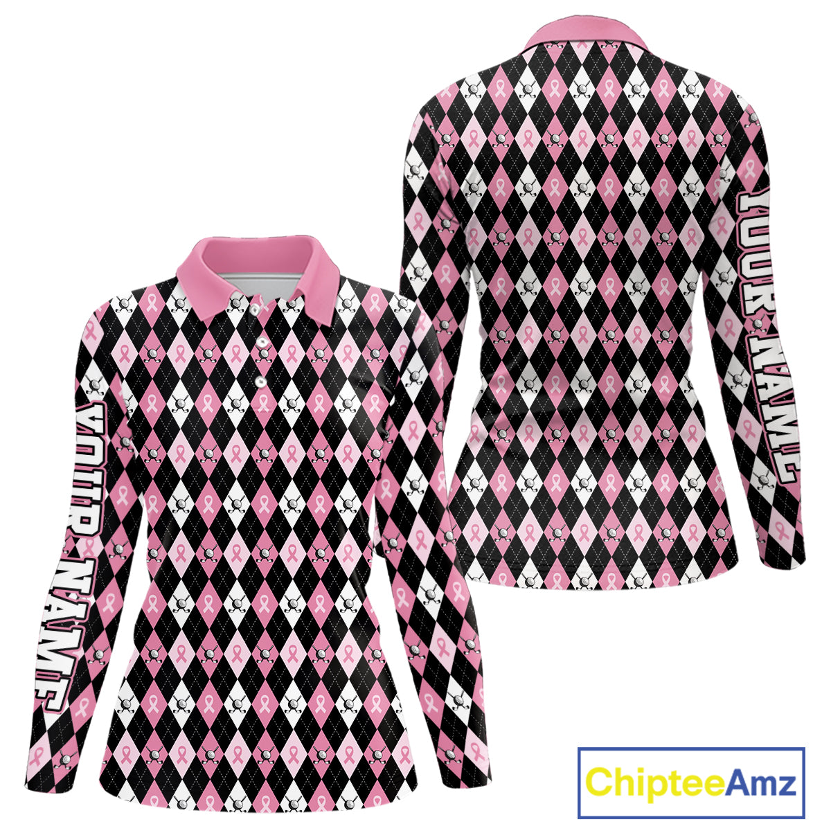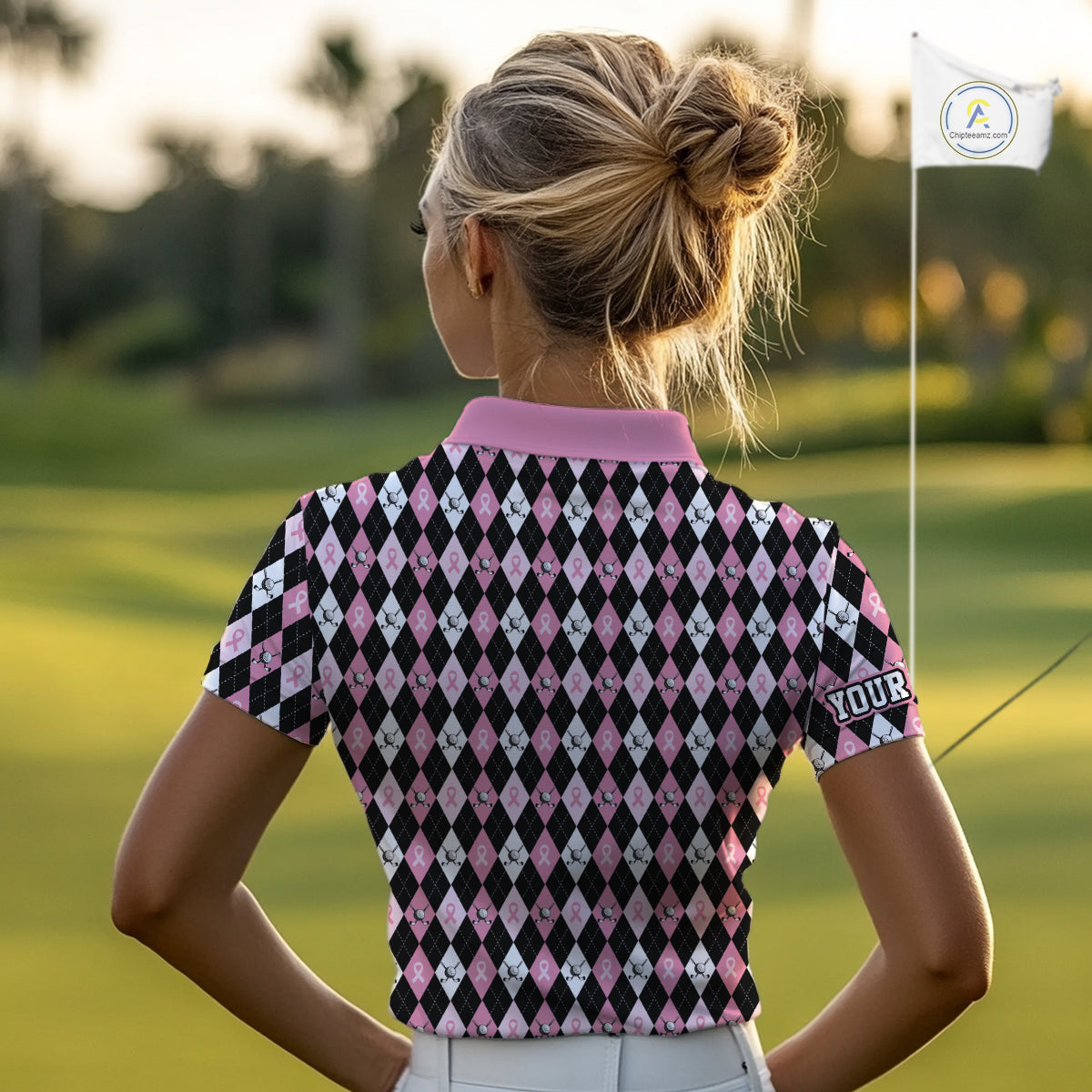 Black & Pink ribbons argyle pattern Women golf polo shirt Custom Breast Cancer Awareness golf outfit NQS10513