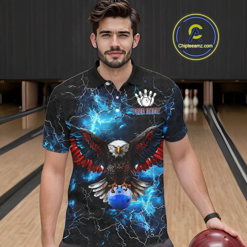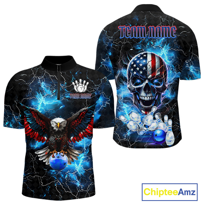 Blue Thunder Lightning American Flag Eagle Skull Mens Bowling Shirts Custom Bowling Team Jersey NQS10724