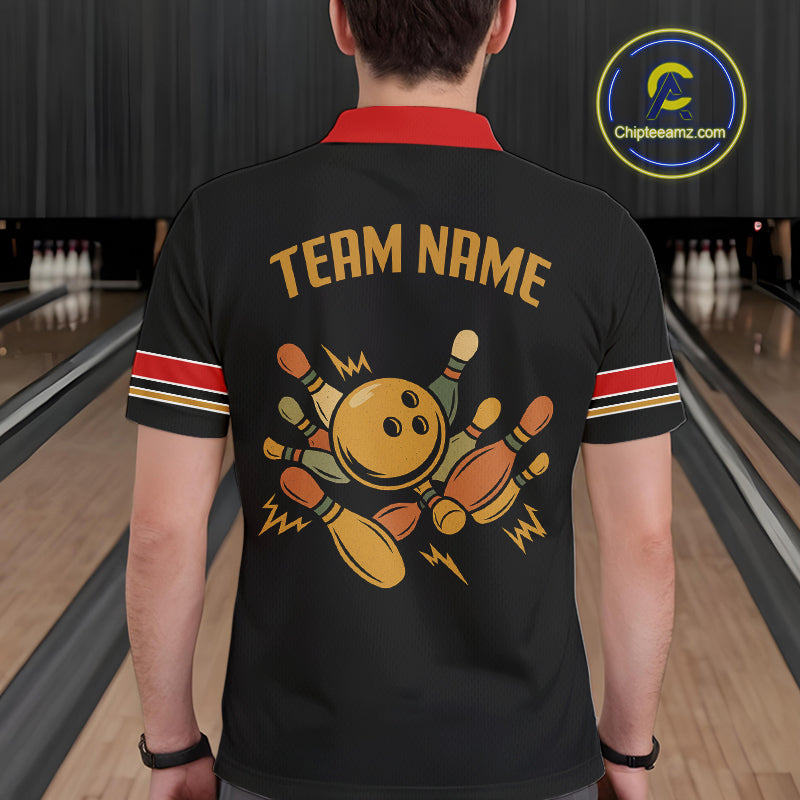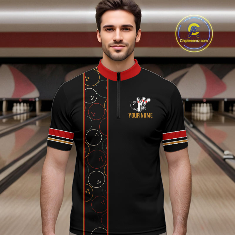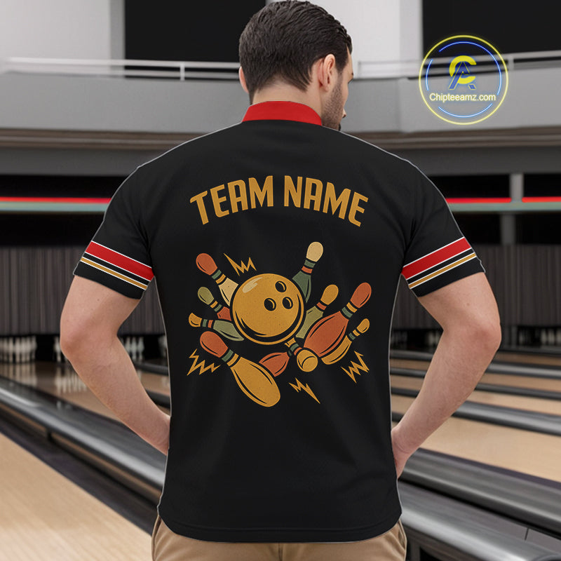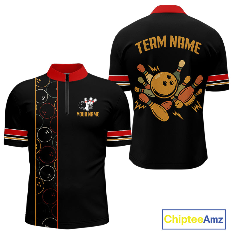Custom Retro Black Mens Bowling Polo, Quarter Zip shirts, Personalized vintage bowling team jerseys NQS10548