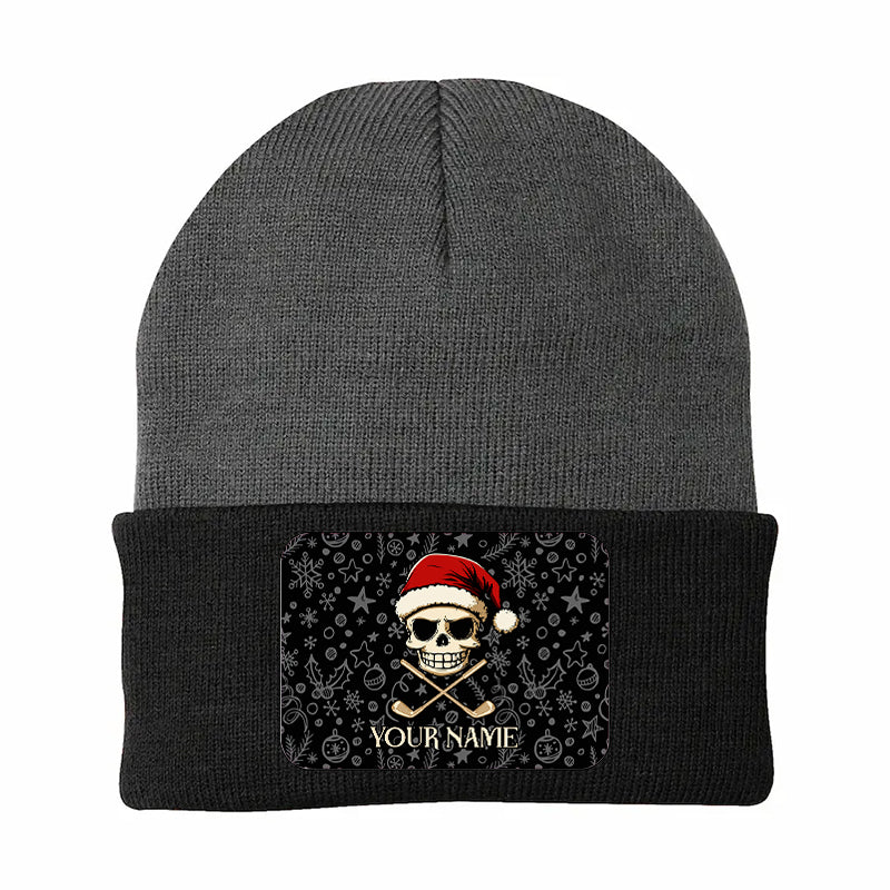 Funny Christmas Skull Golf Knit Beanie Hat, Custom Rectangle Patch Golf Beanie Hat, Xmas Golf Gifts NQS10783