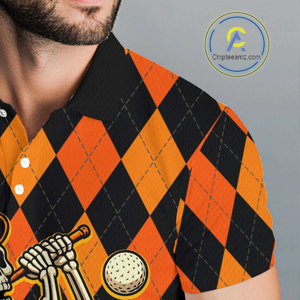 Funny Mens golf polo shirts custom orange and black argyle plaid Halloween Skull golf attire for men NQS10355