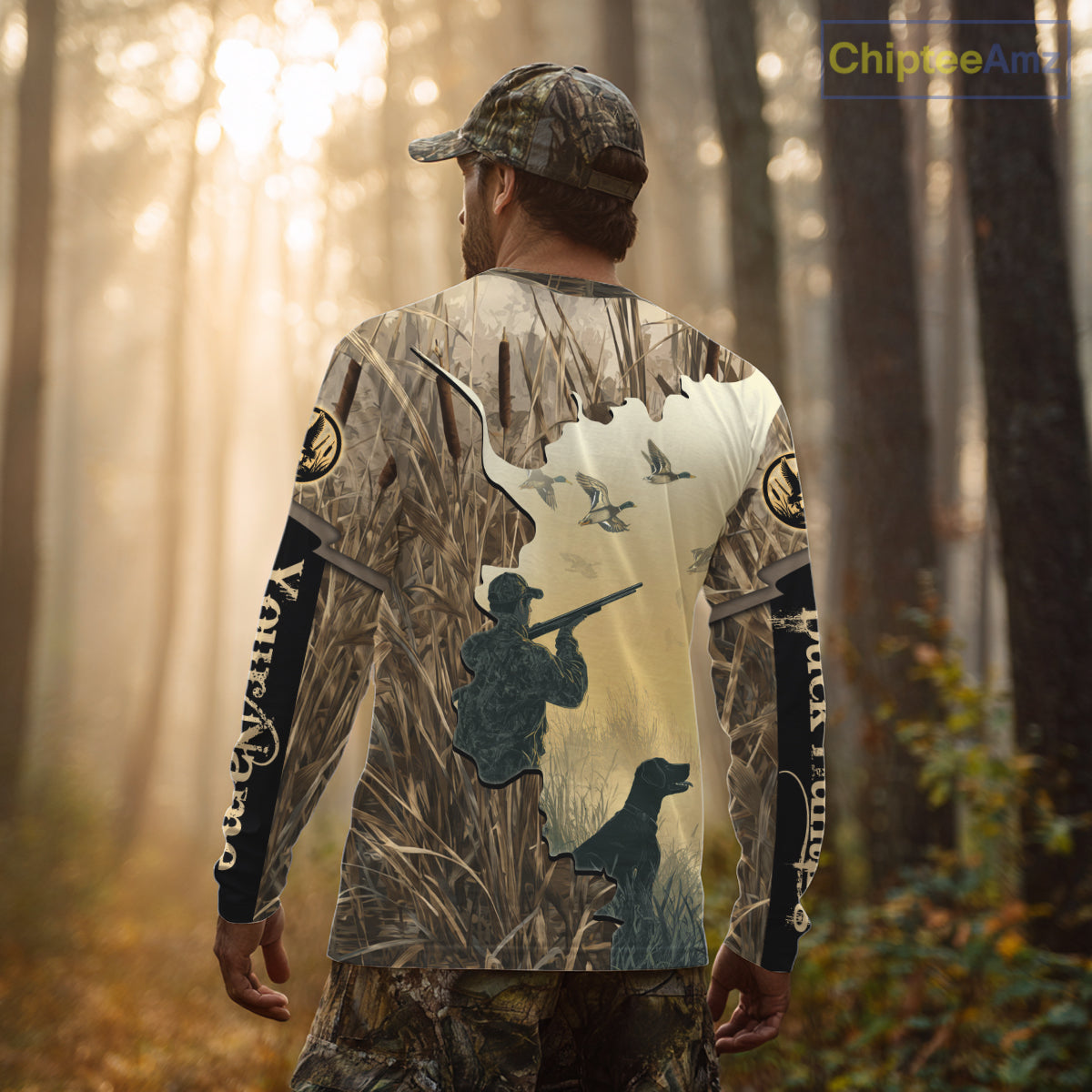 Designed for duck hunters and outdoor enthusiasts, this shirt combines style, comfort, breathability, and functionality in one. Featuring a unique waterfowl-inspired design, it can be personalized with your name, along with details like the American flag, realistic grass camo patterns, and even your loyal hunting dog – making it the perfect gift idea for hunters during duck hunting season.