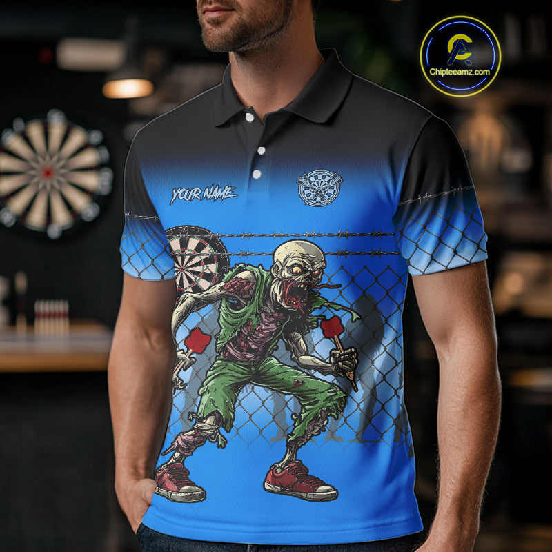 Blue Funny Zombie Dart Shirt With Pocket Option For Men Custom Darts Jersey TDM4937
