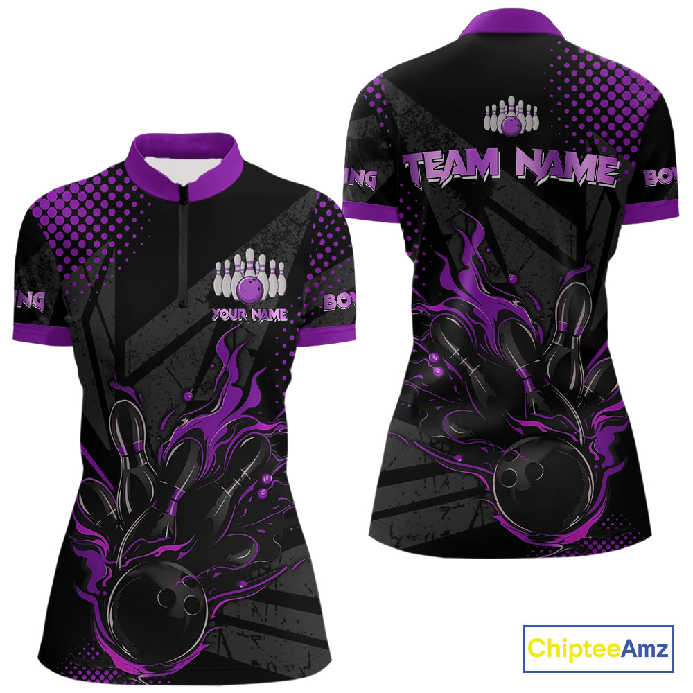 Personalized Black and Purple Flame Bowling Polo, 1/4 Zip Shirt For Women, Custom bowling Team Jersey NQS10773