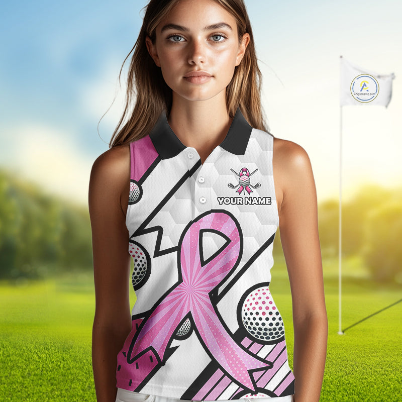 Personalized Pink Ribbons Camo Sleeveless polo Shirt for Women, Custom breast cancer Golf Team shirts NQS10534